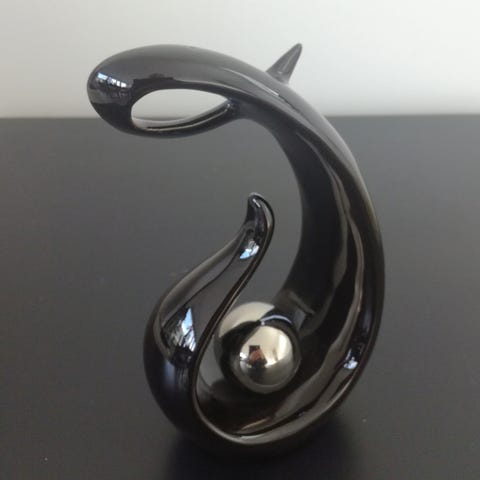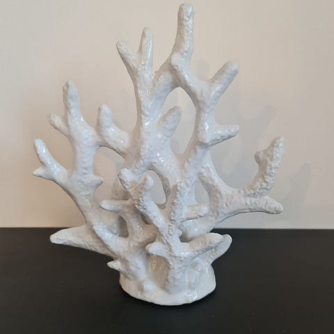 Dekorativ hånd skulptur i brun keramik. Skulpturen forestiller en realistisk menneskehånd og er udført i et rustikt, brunligt materiale med synlig struktur. Egnet som pyntegenstand på bord, hylde eller reol, eller som del af en kunst- eller samlerobjektsamling. Kan placeres liggende og fungerer som et mindre kunstobjekt til indretning.