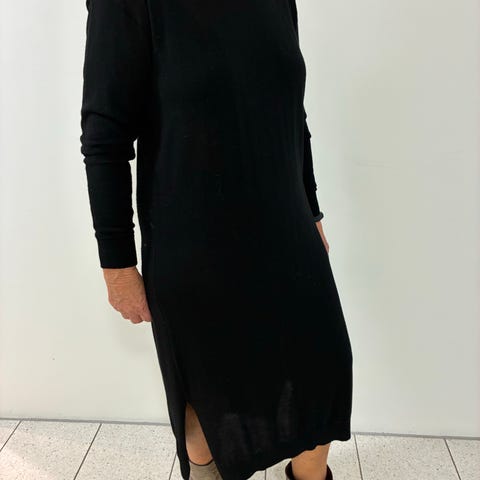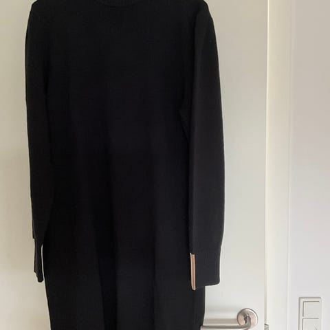 Super lækker ribstrikket kjole med lidt høj hals fra H&M i en flot og lækker strik. Den har lange ærmer med lidt vidde forneden - se fotos. Det er en str L og den passer str 42/44 - der er masser af fleksibilitet i strikken, da den er ribstrikket. Farven er en flot mørkebrun farve - se fotos. Materialet er Pure Merino Uld og den er superblød, lun og lækker og den kradser absolut ikke. Kjolen er helt ny med mærker. Sælges for 500 kr. NU NEDSAT TIL 400 KR.