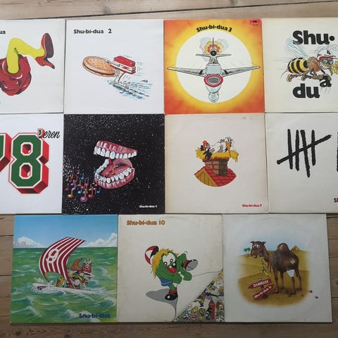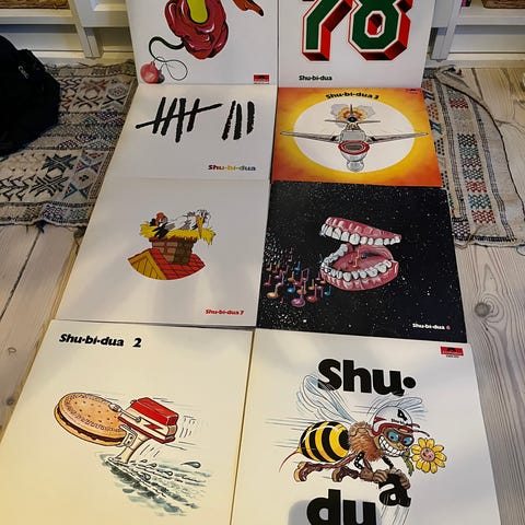 Shu-bi-dua LP plader samling. Inkluderer flere af gruppens album, blandt andet Shu-bi-dua 1, Shu-bi-dua 2, Shu-bi-dua 3 samt et album med SBD på forsiden. Velegnet til samlere af dansk rock og pop på vinyl.