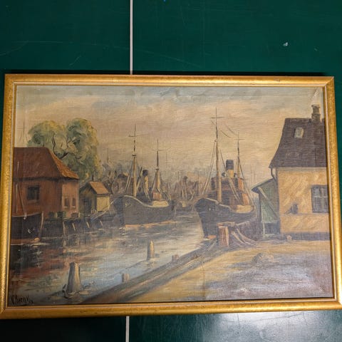 Smukt lille oliemaleri af Maleri af Jens Sinding Christensen med motiv af Christianshavns Kanal med Christians Kirke i baggrunden.