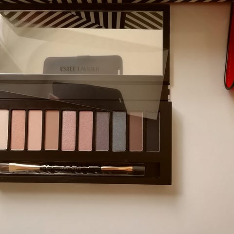 Estée Lauder makeup- og hudplejesæt med rød kosmetiktaske. Sættet indeholder forskellige hudplejeprodukter samt makeup, herunder øjenskyggepalette, læbeprodukter og mascara. Produkterne leveres samlet i en rød kosmetiktaske med lynlås og sløjfedetalje. Designet er koordineret i røde og gyldne nuancer, og emballagen har et mønstret rødt og hvidt ydre med Estée Lauder-logo.