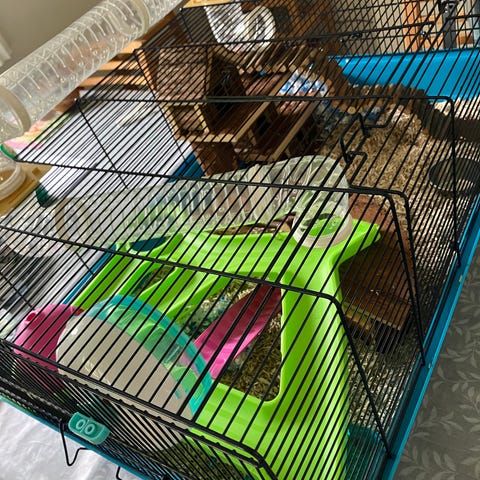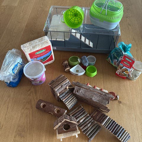 Hamsterbur med masser af legetøj, gemmesteder, mad, drikkeflaske og andet tilbehør. Alt hvad man behøver for at starte op. Masser af forskellig strøelse medfølger også.