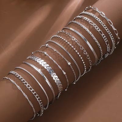Armbånd sæt i stål i sølvfarve. Sættet består af fem åbne armringe i forskellige enkle og dekorative designs, herunder glatte, snoede og knudeformede modeller. Armbåndene er stive/halvstive og kan bæres samlet eller enkeltvis. Fremstillet i stål, som giver en glat og blank overflade. Velegnet som modeaccessory til hverdagsbrug eller ved særlige lejligheder.