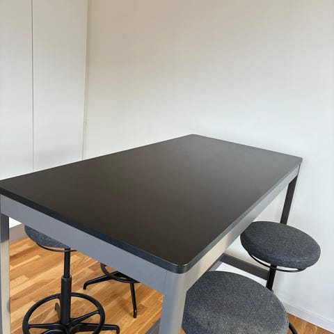Rund taburet med sort sæde og metalstel. Sædet er rundt med knap i midten, og understellet består af flere ben med rund fodring, der fungerer som fodstøtte. Egnet som siddeplads ved bord, disk eller arbejdsplads i hjem eller kontor.