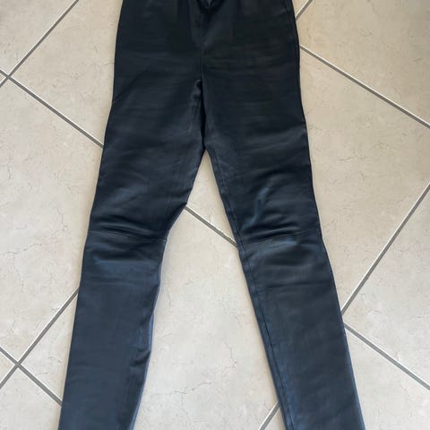 Mos Mosh leggings til kvinder i sort læder, størrelse S. Tætsiddende model med lange ben. Velegnet til hverdagsbrug eller som del af et mere festligt outfit. Materialet er læder, som giver et glat og struktureret udtryk.