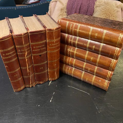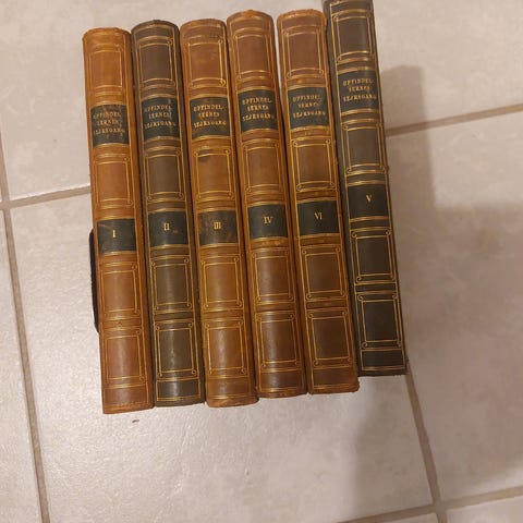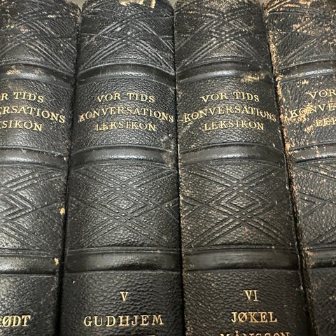 Kan bruges til hyggelæsning, opslag eller som dekoration på en hylde. Bøgerne er fra 1877.
