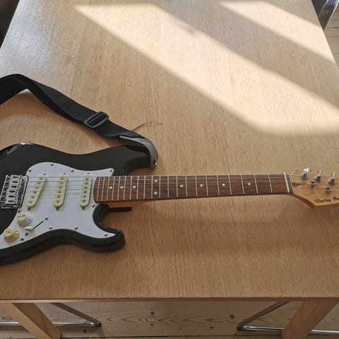 En lille 1/2 størrelse guitar som virker fint. Næsten aldrig brugt. Jeg brugte den som elektrisk ukulele til et enkelt projekt.