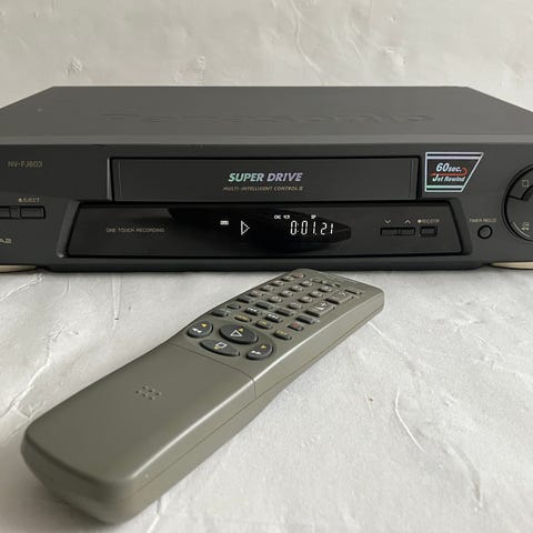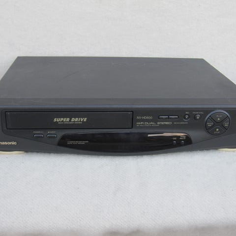 Panasonic Super Drive i sølvfarvet kabinet. Enheden har frontindlæsning til VHS-bånd og digitalt display på fronten. Betjeningsknapper og drejehjul sidder på højre side af frontpanelet. Tilsluttes tv eller anden skærm via de relevante video- og lydudgange på bagsiden.