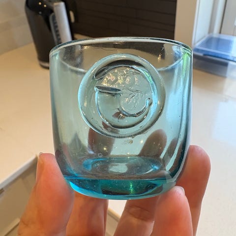 Holmegaard glassæt bestående af flere dele i klar og blåligt tonet glas.