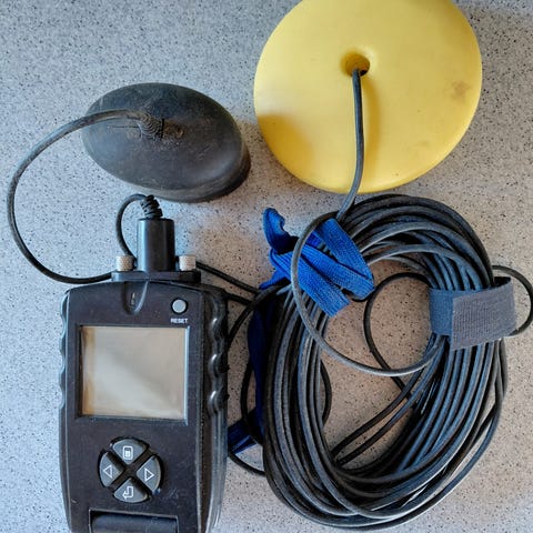 Eagle Cuda 128 fishfinder med transducer, til batteri (8xAA). Enheden har display med betjeningsknapper på fronten og leveres med kabler og transducer med sugekopbeslag til montering på båd. Velegnet til brug ved fiskeri til visning af dybde og fisk under båden.