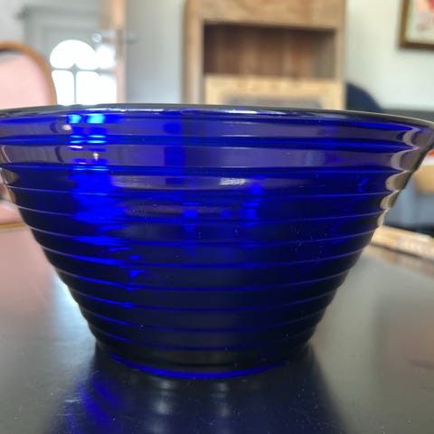 Ældre bordskål i flot koboltblå farve med riflet overflade. Dekorativ pynt til bord, flot som frugtskål m.m. Pæn stand med få brugsspor.