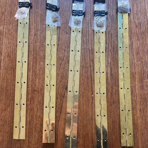 Sæt med 15 små messinghængsler og 6 kroge til møbler eller kasser. Hængslerne er egnede til mindre låger, skuffer eller trææsker, og krogene kan bruges som lukkebeslag eller ophæng. Sælges samlet som vist på billedet.