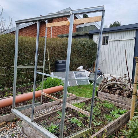 Adskilt drivhus som monteres til væg. Mangler et par ruder,