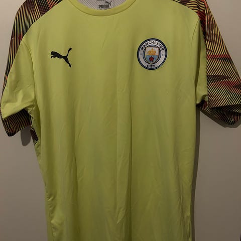 Man City T-shirt i blå med tryk af tre pixel-figurer på fronten og teksten "Man City 23/24". Kortærmet og i bomuld, ubrugt. Købt på Man City hjemmeside. Str. 13-14 / 164 - men lille i størrelsen.