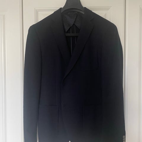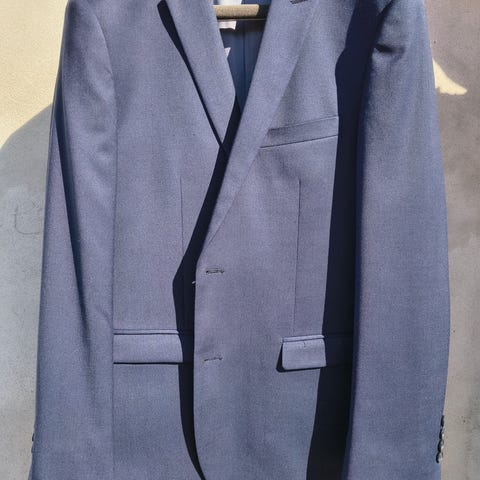 Hugo Boss herrejakke i uld, str. 52, i blå farve. Klassisk jakke med revers, to-knaps lukning og forlommer. Egnet som del af jakkesæt eller som separat blazer til hverdag og mere formelle anledninger.
