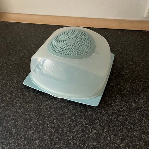 Tupperware osteboks i plast med aftagelig rist og firkantet bund i lyseblå nuance.