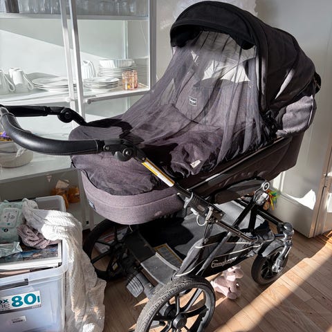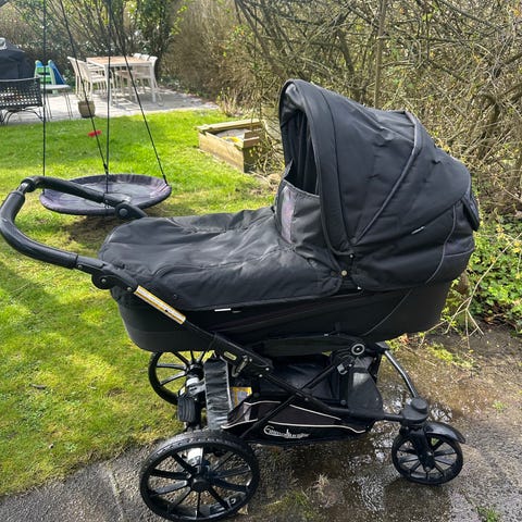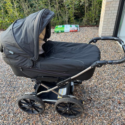 Emmaljunga barnevogn i sort. Vognen har liggedel med lys indvendig polstring og matchende kørepose/overdække. Stor kaleche med integreret netsektion, der kan åbnes for ekstra ventilation. Stel i metal med fire store hjul og varekurv under vognen. Egnet til spædbarn/baby til liggekørsel på gåture og daglig transport.