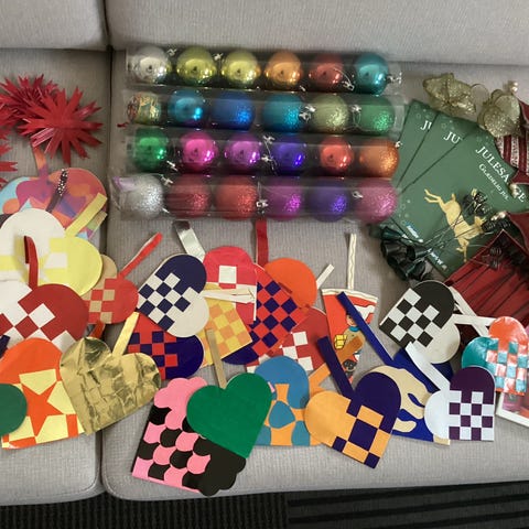 Ornamenter, Hjerter og æbler. Har flere lag så de kan foldes ud og får facon. Ældre julepynt.
