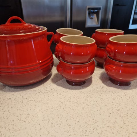 Le Creuset suppeterrin i stentøj. Terrinen har to håndtag og låg samt cremefarvet inderside og bund. Ydersiden er rødglaseret. Egnet til servering af suppe, gryderetter eller andre varme og kolde retter ved bordet. Kan typisk anvendes i ovn og mikroovn samt tåler opvaskemaskine.
