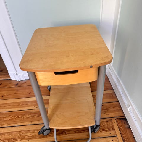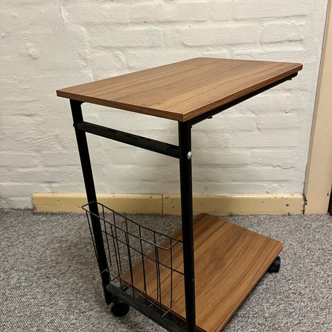Rullebord i bøgetræ med plads til en stationær PC og en printer ovenpå.