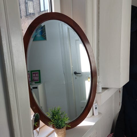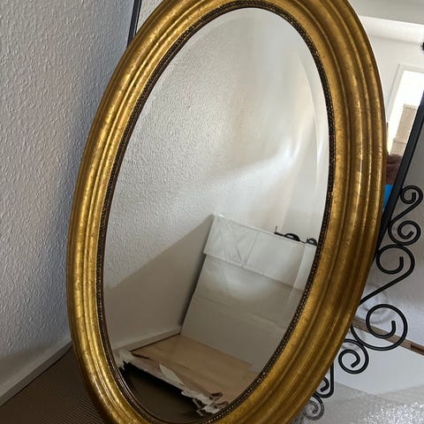 Smukt vintage ovalt vægspejl med sort ramme med flotte dekorationer i guldfarvet.