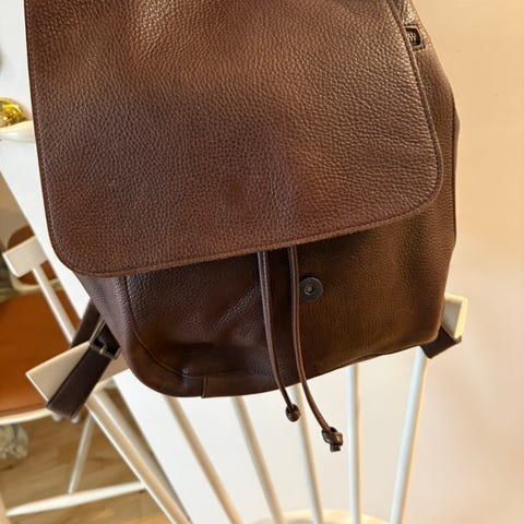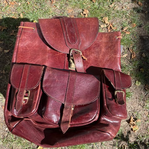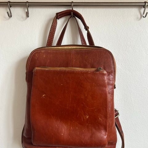 Kernelæderrygsæk købt i -1978 og brugt som skoletaske i mange år.
