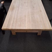 Rigtig fint bord i ubehandlet træ. Bordet kan forlænges i begge sider med sider, der kan klappes op og ned.