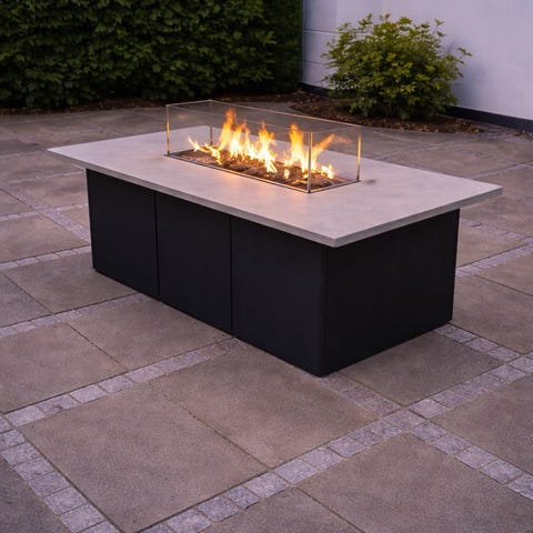 Manhattan Gaspejs bord (91x91x40 cm) med indbygget brænder, glasafskærmning og lavasten. Bordet har integreret betjeningspanel med regulering af gasflamme. Velegnet som udendørs varme- og hyggekilde på terrasse eller altan, hvor gasflaske tilsluttes via slange under bordet. Overfladen fremstår i betonlook med firkantet brænderfelt i midten dækket af lavasten og omgivet af glas.