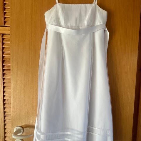 Konfirmation kjole, til knæene. Overdelen har blondeeffekt med lange ærmer og rund halsudskæring. Lukkes bagpå med perler. Underdelen er glat og let A-formet. Nypris ca 2.500kr. Mærket er “Nicole de Val” (kunne ikke vælge dette i kategorier). Kun brugt 1 gang 😊