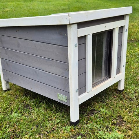 -Træ kaninhus i lille model i grå og hvid. Huset har dør og vinduer med udvendige skodder samt tag med tagplader som kan åbnes i den ene side. Egnet som husly til mindre kæledyr, f.eks. kaniner eller gnavere, i have eller løbegård.