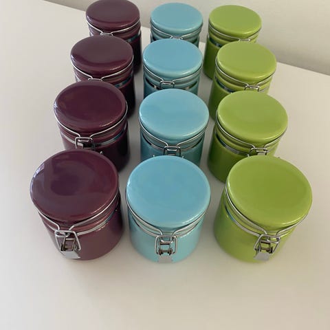 3 flotte dåser i fine farver. Diameter 11 cm. Den mindste er ca. 12 cm høj og den største ca. 15 cm. Sælges samlet.