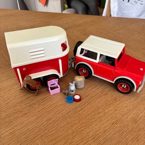 Schleich legetøjsbil med hestetrailer i plast. Sættet består af en bil med aftageligt tag, reservehjul bagpå og tilkoblet hestetrailer . Legetøjet er udført i plast med rullende hjul og er egnet til leg med dyr og hestetilbehør fra samme størrelse/serie.