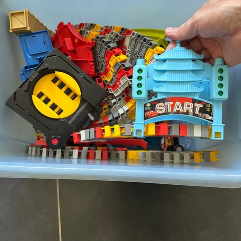 Flexi track bilbane med plastskinner i flere farver. Sættet består af et større antal buede og lige skinner samt enkelte tilbehørsdele, som f.eks. en station eller rampe-del. Delene kan samles på forskellige måder til baner, hvor små biler kan køre rundt. Egnet som byggesæt til leg på gulv eller bord for børn, der kan lide at konstruere og ændre banen efter behov. Der med følger 6 biler der kan kører