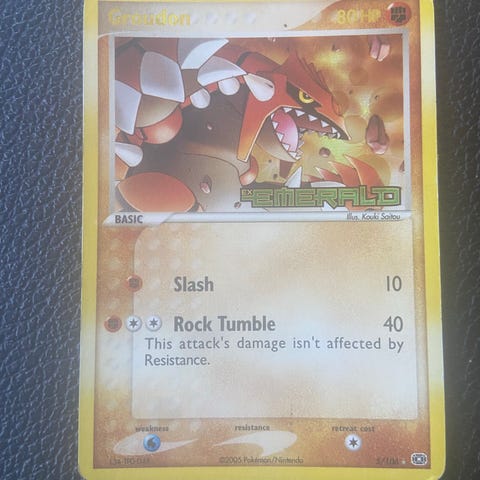 Pokémon Primal Groudon EX samlekort med holo-effekt. Kortet viser Primal Groudon EX med angrebet Gaia Volcano og har 240 HP. Velegnet til samling eller spil i Pokémon Trading Card Game.