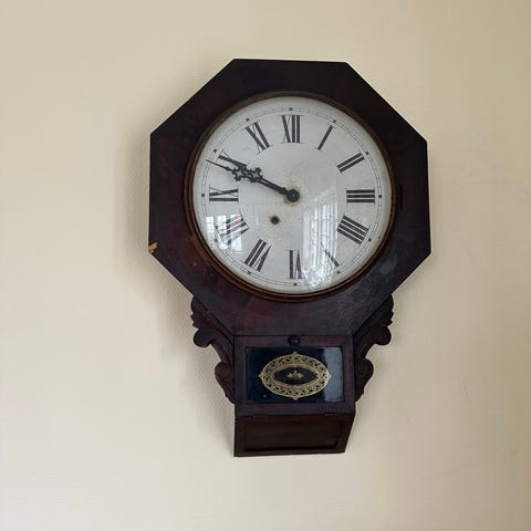 Design: Hvid urskive med romertal og messingramme.