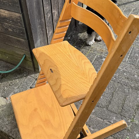 Stokke højstol i sort træ. Klassisk justerbar højstol med fodplade og siddeplade, der kan tilpasses barnets højde. Egnet som spise- og siddeplads ved bordet for børn. Fremstillet i træ med sort overflade.
