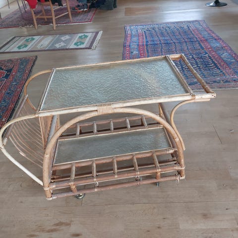 Serveringsvogn / barbord / rullevogn / rullebord i mørkt træ, på øverste hylde er der en glas plade (som kan fjernes) og nederste hylde i træ. Vognen står på fire hjul, som gør den let at flytte rundt. Egnet som barvogn, sidebord eller ekstra afsætningsplads i stue, køkken eller spisestue.