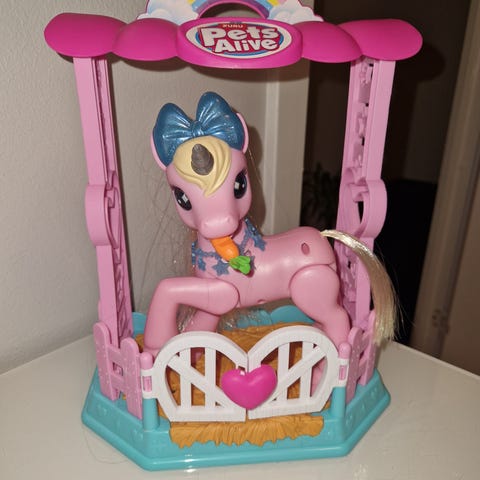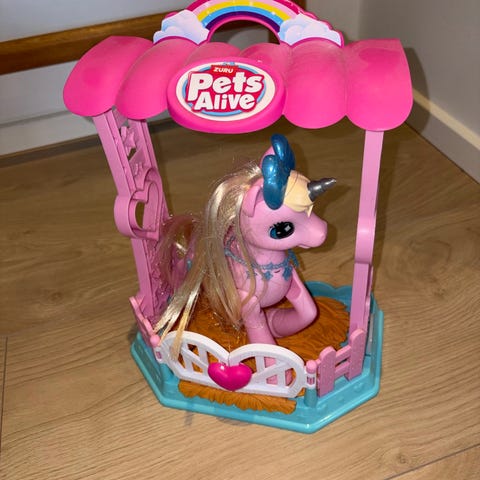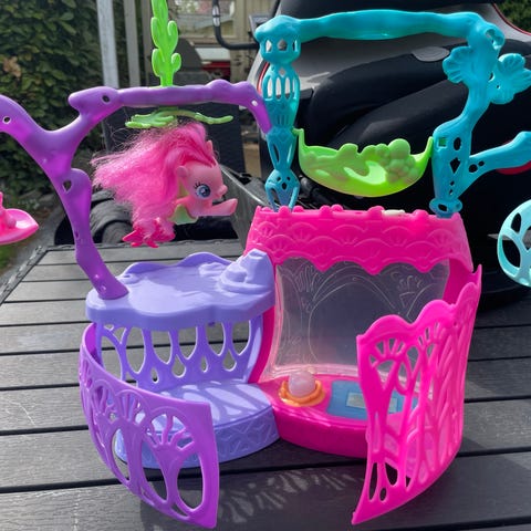 Polly Pocket enhjørning legesæt i plast. Sættet er udformet som en lyserød enhjørning med lilla manke og hale, der kan åbnes og lukkes som et lille legeunivers. Indvendigt er der en farverig legeverden med blandt andet hus, have og små detaljer som skyer, regnbue og sol. Legesættet har bærehåndtag, så det er nemt at tage med på farten. Velegnet til børns rolleleg og fantasileg.