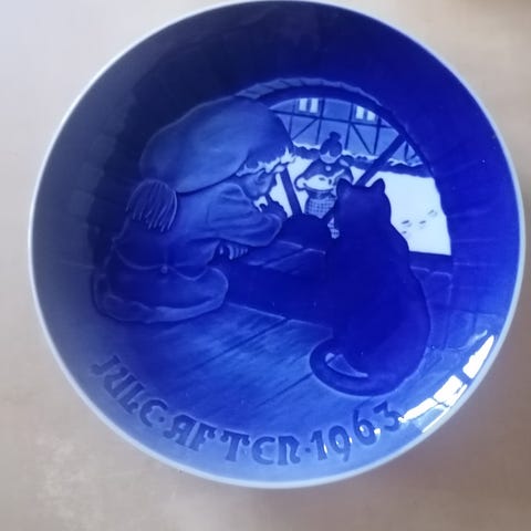 Bing & Grøndahl juleplatte fra 1963 i porcelæn. Motivet viser en nisse og en kat ved et vindue, udført i blå-hvide nuancer. Tallerkenen har ophængssnor på bagsiden, så den kan bruges som vægdekoration. Velegnet som samlerobjekt eller som del af en juleudsmykning.