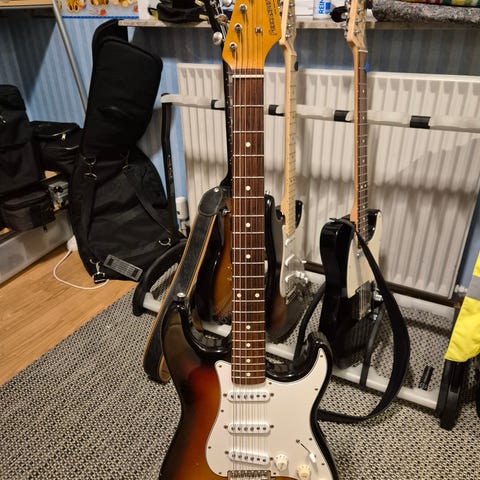Sælger denne fede Tom delonge SQUIER starcaster lavet af house95guitars i England. Der er ikke spillet på den, så derfor helt ny !