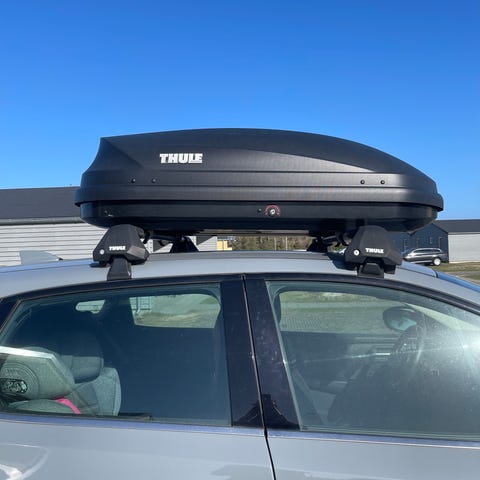 Tagboks i grå. Egnet til montering på tagbøjler på bil for ekstra bagageplads.