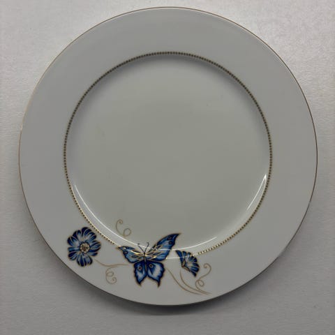 Fyrklövern Classic middagstallerken i hvidt porcelæn med blå sommerfugle- og blomstermotiv samt guldkant. Velegnet som middagstallerken i stellet fra Fyrklövern. Porcelænet er mærket som opvaskemaskesikkert på bagsiden. Kan sendes mod betaling og afhentes på adressen.