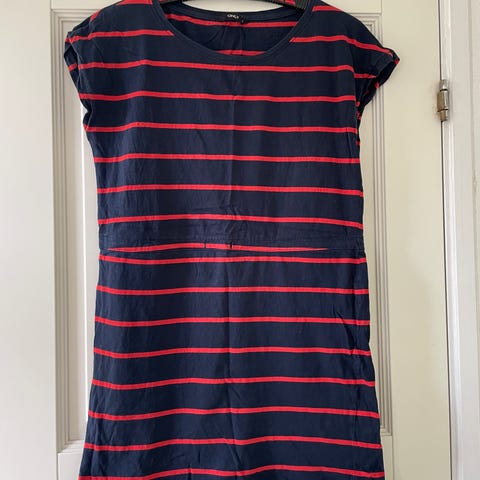 ONLY hverdagskjole i størrelse S. Kjolen er fremstillet i bomuld og har brede, vandrette striber i sort og hvid. Modellen har rund hals og korte ærmer. Egnet som hverdagskjole til kvinder. Kort model. Længde: 83 cm. Bredde hen over brystet: 47 cm. Fin stand, har lidt vaskefnuller. Fejler ikke noget, har ingen pletter eller huller. Der har været bindebånd i taljen, jeg har taget det ud og det følger ikke med. Meget blød :-) Se også mine andre annoncer med sommertøj; kjoler, bukser, nederdele, skjorter. Sælger gerne med rabat hvis du vælger flere dele :-) sender gerne.