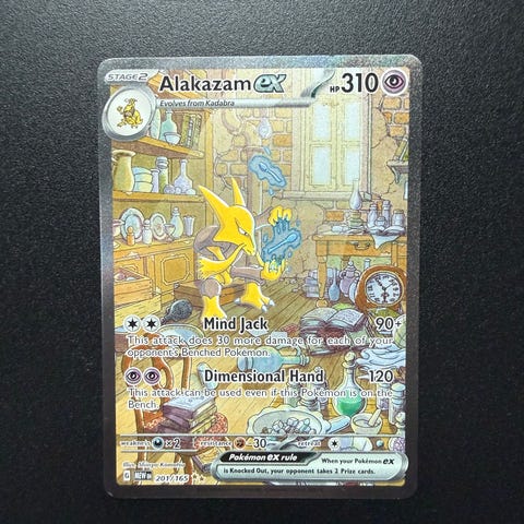 Pokémon M Alakazam EX kort med holo-effekt. Samlekort til Pokémon Trading Card Game med motiv af M Alakazam på forsiden og standard Pokémon bagside. Egnet til samling eller brug i spil afhængigt af sæt og regler, som fremgår af kortets tekst og symboler.