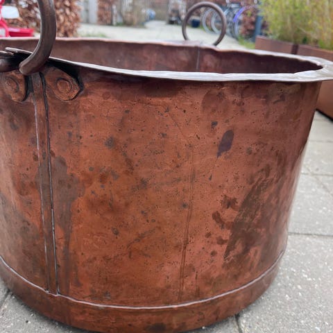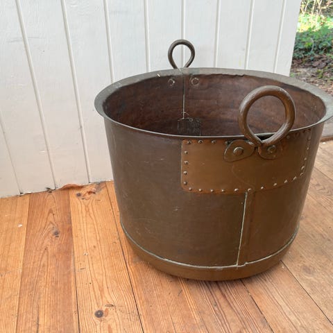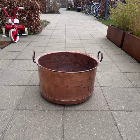 Kobber brændekurv med messinghank. Gryden er fremstillet i kobber med dekorativt udformede hanke i messing. Indersiden og bunden viser tydelige spor af brug, slitage og misfarvning. Egner sig primært til dekoration, opbevaring eller som rustikt indslag i indretningen frem for egentlig madlavning i nuværende stand.