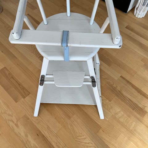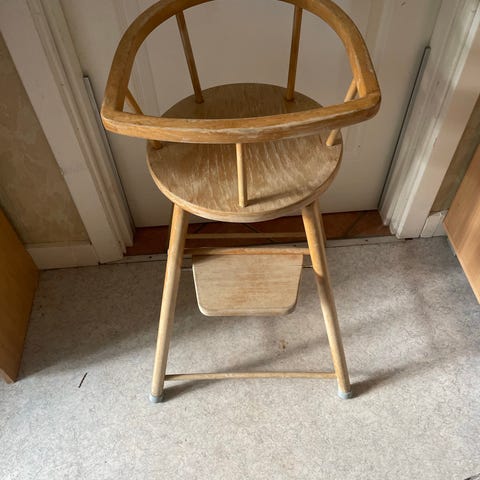 IKEA højstol i træ i sort. Højstolen har ryglæn med tremmer og fodstøtte. Egnet til brug ved bord eller køkkenbord til børn, hvor der ønskes en høj siddeposition. Overfladen fremstår malet i sort med synlige brugsspor på kanter og ryglæn.