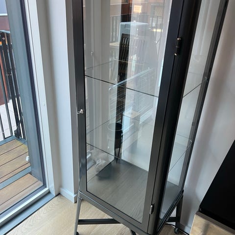 Fabrikör vitrineskab fra Ikea, i metal og glas. Skabet er cremefarvet, udgået farve fra Ikea.