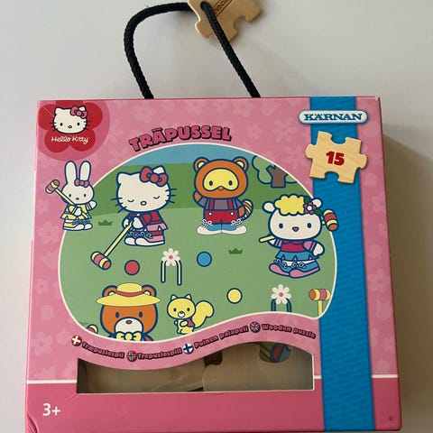 Hello Kitty træklodser sæt i trækasse. Sættet består af træklodser med Hello Kitty motiver, opbevaret i en trækasse med udskårne håndtag i siderne. Klodserne har forskellige størrelser og former med trykte figurer og motiver. Egnet til leg, byggeri og motoriktræning for børn samt som samler- eller pyntegenstand for Hello Kitty interesserede.