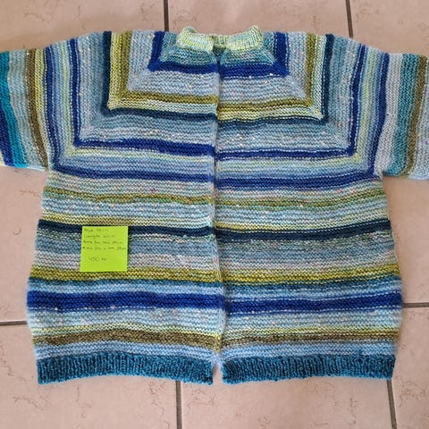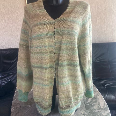 Strikket cardigan, brugt få gange. Primært i uld og mohair, også lidt glimmergarn i. Intet akrylgarn i.
