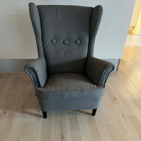 IKEA børnelænestol i gråt stof. Stolen har høj ryg med tre dekorative knapper, faste armlæn og polstret sæde. Velegnet som komfortabel siddeplads til børn i stue, børneværelse eller legeområde.